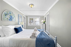 3 Bedrooms • 1 Bathroom 1 Bath • Sleeps 3-6This home has three bedrooms with one bathroom. All bedrooms have queen beds. The first and third bedrooms have blackout curtains in addition to blinds. The middle bedroom has blinds with a pass-through door to the third bedroom. There are two living areas in the house, one with a brand-new 4 K smart television. The back living space focuses on the original stained glass window. The bathroom has been updated with modern touches while retaining the rustic charm. Soft hand and body towels are provided for all guests. Shampoo, conditioner, and body wash are also provided. The kitchen has been updated with granite countertops and a tile backsplash, but still retains some of the unique features of older houses. Inside the kitchen, ground coffee and a limited selection of K-Cups are provided. The kitchen is also where the washer and dryer are located. Guests can enjoy sitting on the covered front porch or covered side porches, both of which offer views of the street lined with old trees. The neighborhood itself is very quiet with the property located on a dead-end street, limiting traffic. When entering the house, guests will be assigned a private digital keycode, meaning no physical keys will need to be exchanged or carried around during guests' stay.